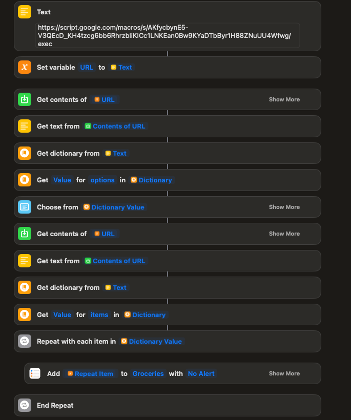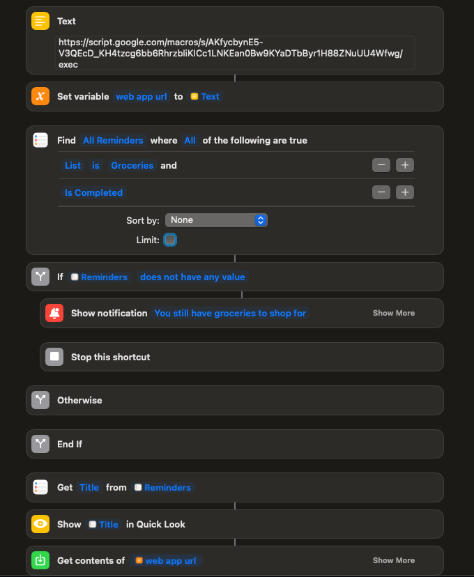 One thing to note: this flow writes to Reminders, not Google Tasks. If you use both the sheet and the shortcuts, your grocery list will end up split between two apps. Pick one and stick to it.