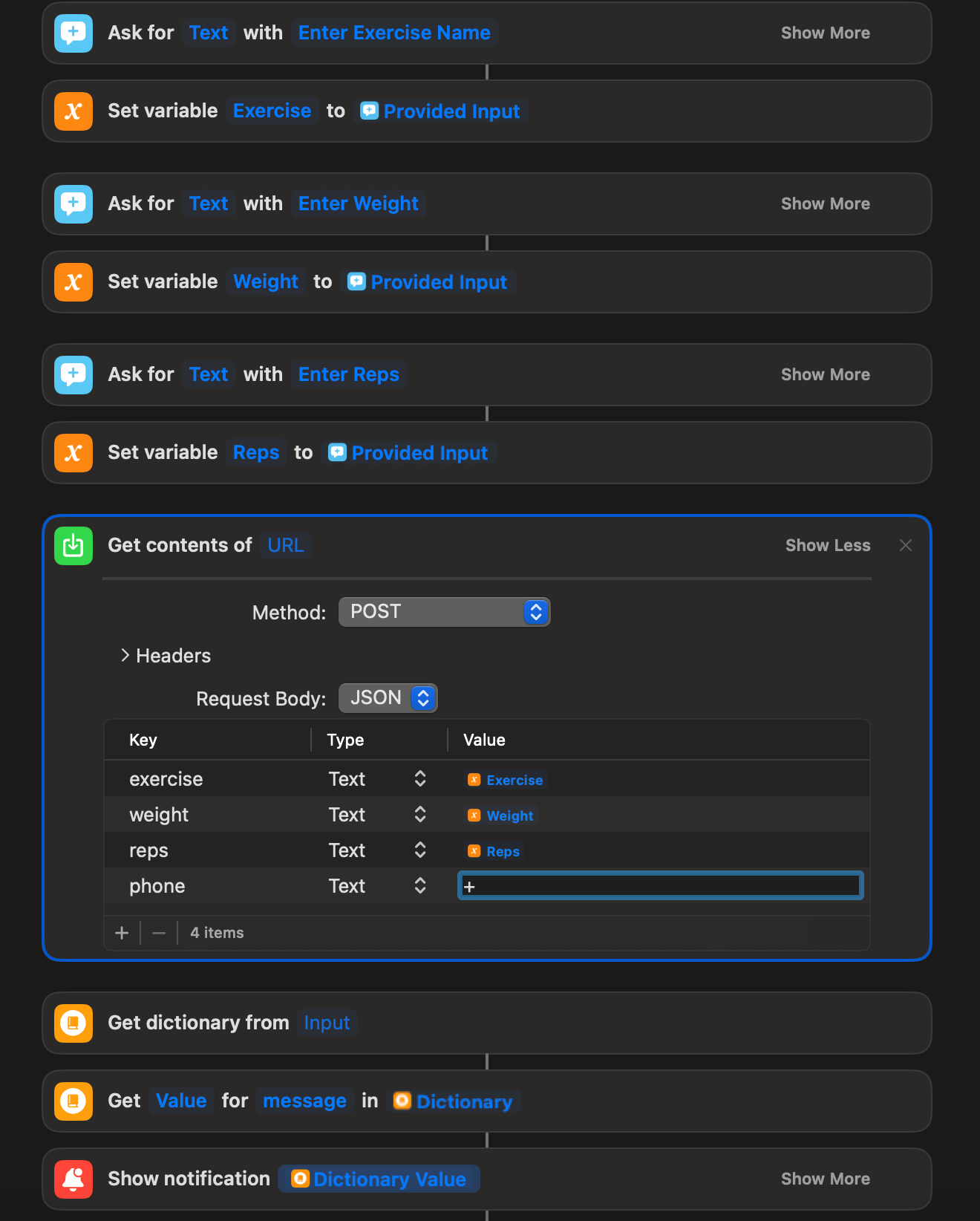 Three prompts (exercise, weight, reps) are saved to a variable. Use the “Get Contents of URL” to make a POST request to your Google App Script with those variables mapped to JSON. The last step is to notify of whatever the Apps Script returns.
